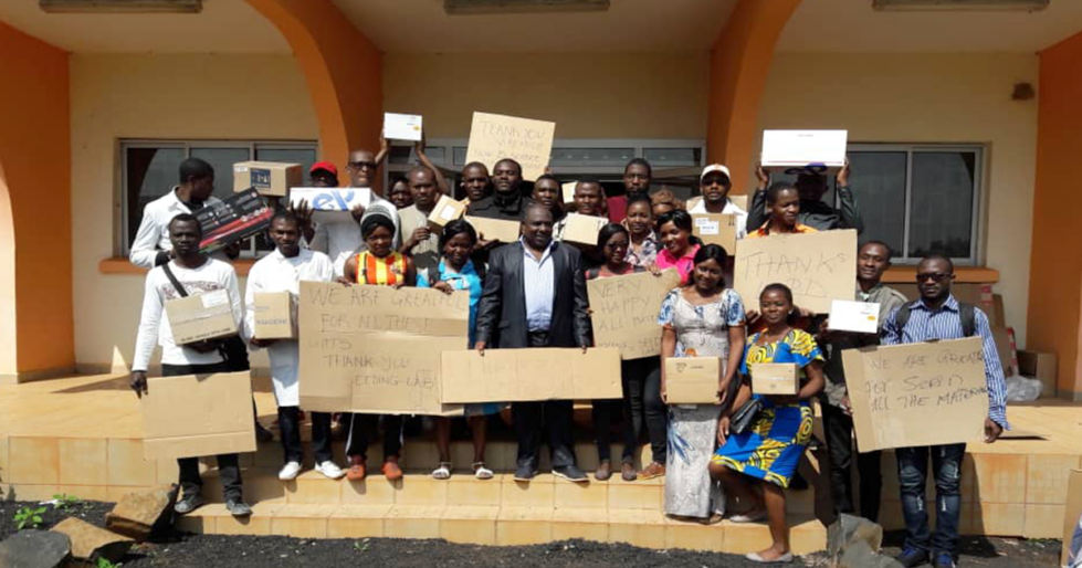 Pictured above: Dr. Jules-Roger Kuiate celebrates with students in the Department of Biochemistry at the Université de Dschang as equipment from an Instrumental Access award arrives on campus in Cameroon.